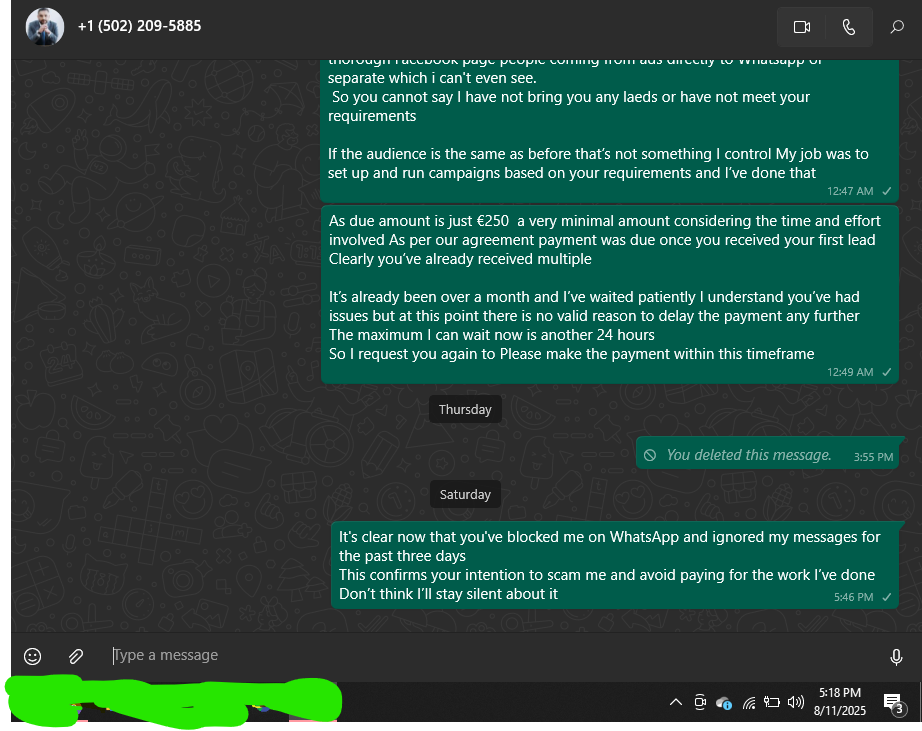 Per favore, non inviargli denaro e non condividere informazioni personali. Non ha un’attività reale solo alcuni numeri WhatsApp e una pagina Facebook falsa. Tutti i dati che mi ha fornito per il sito e le pubblicità sono stati copiati da altri siti. Non può fornire nemmeno una singola informazione autentica e verificabile sulla sua attività.